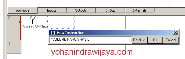 Ternyata diketahui bahwa sebuah P_On tidak terhubung ke sebuah saklar maupun sebuah koil. Bisa dikatakan sebagai kabel terbuka. Selanjutnya masukkan instruksi New Function Block Call untuk memasukkan Function Block yang barusan kita buat. Pada kolom FB Definition, kita pilih NILAI_KOMODITAS, lalu pada kotak kosong FB Instance kita isi dengan (contoh) BENSIN, kemudian lanjutkan dengan klik OK.