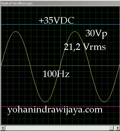Nampak disini sinyal sinus membaik. Berarti ampli ini akan mencapai titik terbaiknya jika sinyal maksimum yang masuk adalah 0,7Vp. Sinyal sinus masih bagus. Dan setelah diukur, tegangan Rms adalah 21,2 VRMS. Supply masih simetris 35VDC. Beban rangkaian adalah 8 Ohm.