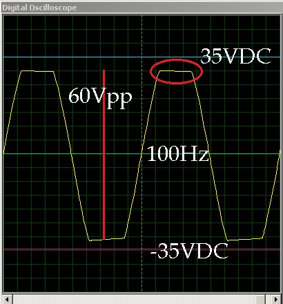 Dari sini nampak bahwa sinyal terpotong pada tegangan 17 volt. Ini menandakan bahwa ampli sudah dalam batas kemampuan untuk amplifikasi. Sinyal ini terpotong karena GAIN yang terlalu besar atau input yang terlalu besar.