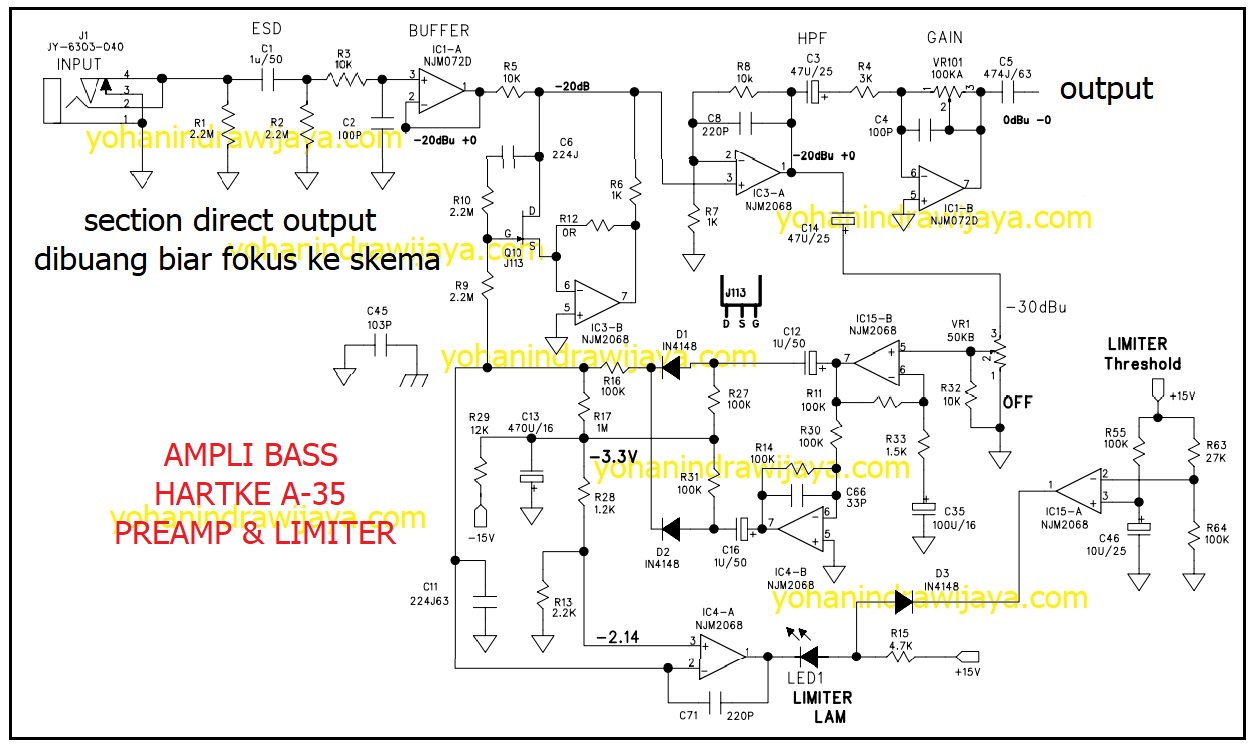 Selanjutnya sinyal ini masuk ke rangkaian limiter yang di atur oleh R6 dan IC3-B. Jika sinyal dari gitar bass terlalu kuat, maka output pada IC3-A akan membesar. Karena membesar, maka dikembalikan lagi oleh IC15-B dan seterusnya hingga menggerakkan FET Q10 untuk mengurangi level oleh IC3-B ini biar selalu terjaga level amplitudo sinyalnya.