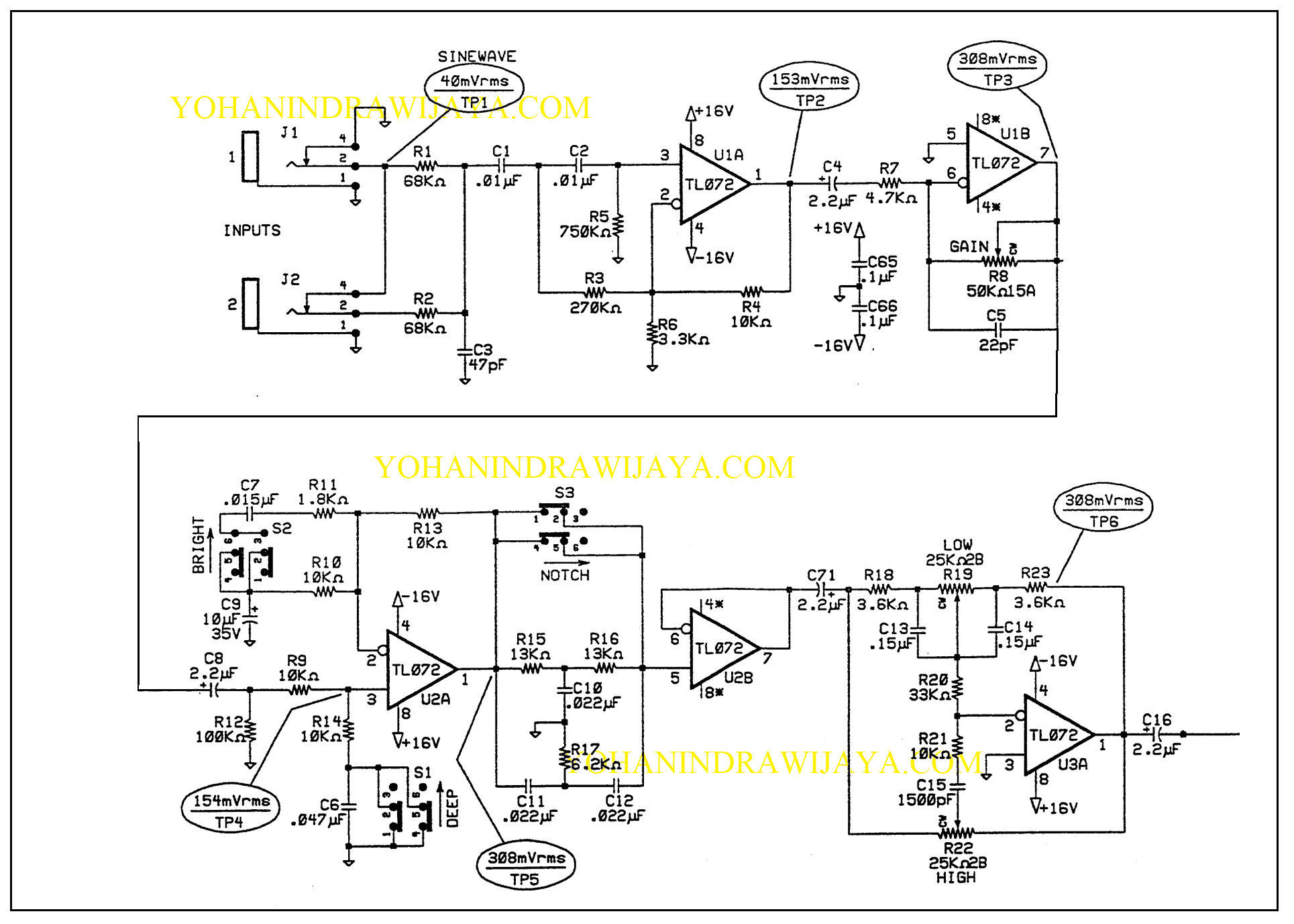 Rangkaian preamp gitar ini memiliki fitur DEEP, NOTCH,dan BRIGHT. Juga ada potensio untuk SHELFING frekwensi LOW dan HIGH yang masing-masing memiliki faktor penguatan 12dB. Skemanya ada dibawah.
