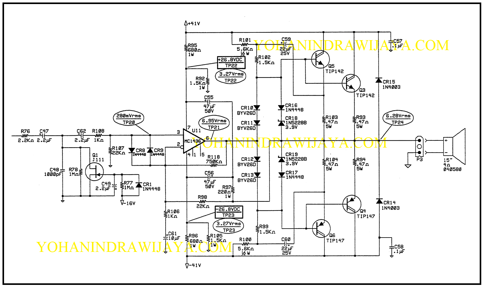 Power Amplifier menggunakan Supplai Simetris 41VDC. Jika Beban sebesar 4 Ohm, maka daya yang dihasilkan oleh ampli ini adalah sekitar 151Watt. Akan tetapi pada manual booknya dijelaskan jika ampli ini hanya mampu sampai daya 100W saja.