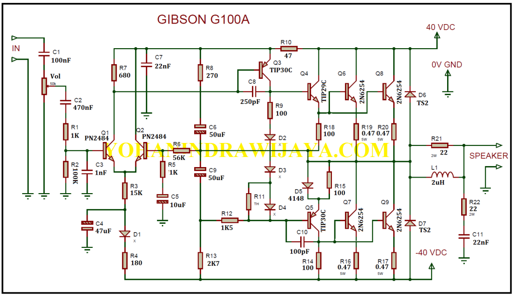 Kali ini saya akan bagikan info tentang skema ampli GIBSON G100A ini. Ampli ini konon memiliki kemampuan output 100Watt.
