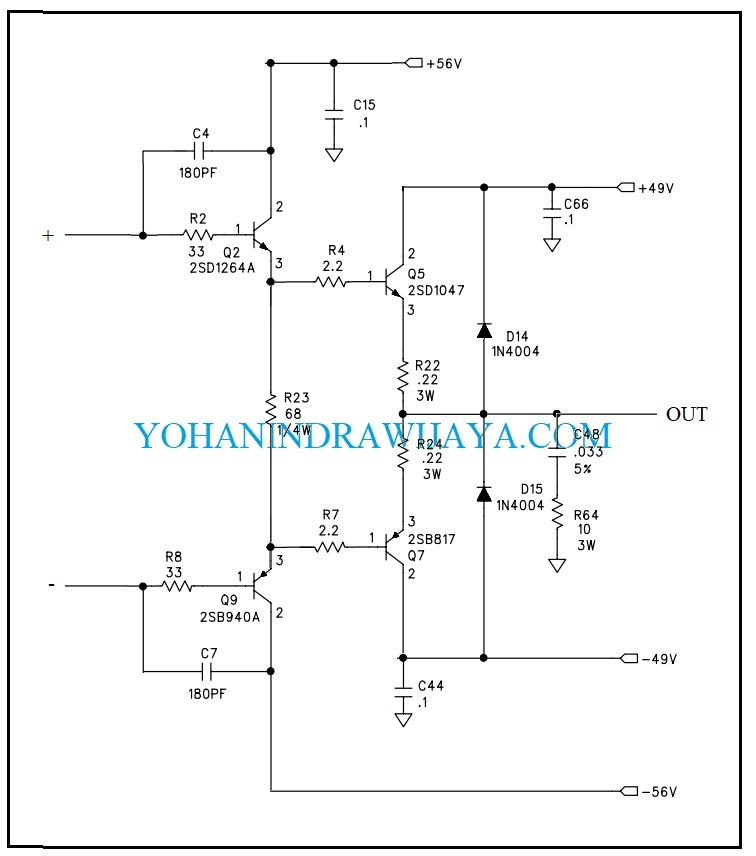 Pada rangkaian ini, menggunakan 6 buah Diode nomer 1N4148 untuk memotong tegangan bias dari rangkaian VAS hingga 4VDC.