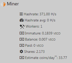 Pool menyebutkan jika kita bisa menghasilkan 33 VECO dalam sehari dengan menggunakan CPU rumah yang bekerja pada hashrate 371H/s.