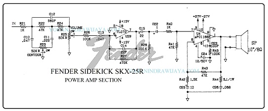Berikut ini adalah skema dari rangkaian Tone Booster dan amplifier dari ampli FENDER SIDEKICK ini.