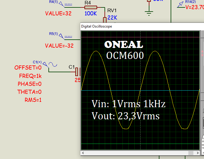 Pada percobaan ini saya menggunakan tegangan 1Vrms berfrekwensi 1kHz untuk masuk ke rangkaian Power ini. Dan hasil yang tercapai adalah sebesar 23,3Vrms pada output. Ini sudah lumayan.
