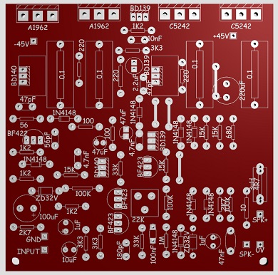 Power Amplifier ini sepertinya menggunakan Tegangan Supply 45V dan transistor KSC5242/ KSA1962 untuk penguat akhirnya.