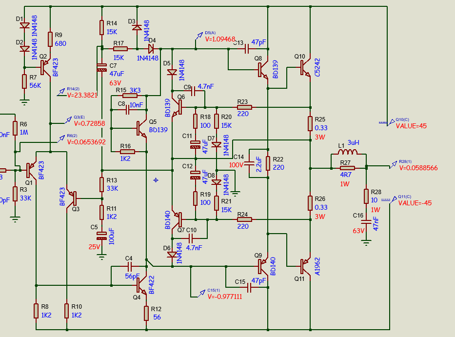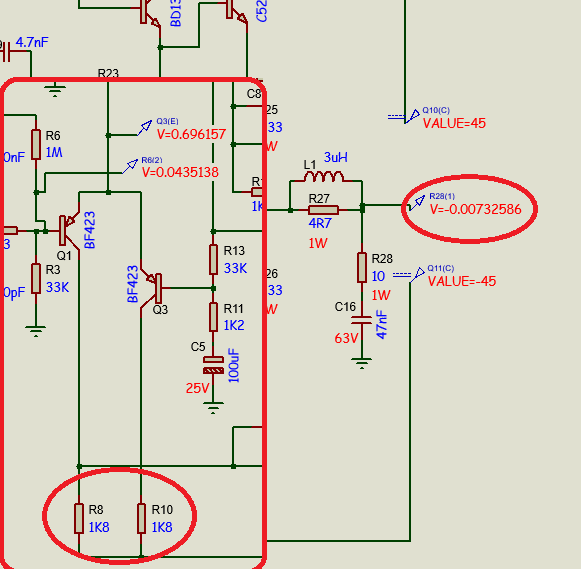 Untuk menekan angka output pada terminal speaker ini, maka setidaknya kita bisa menurunkan arus kerja pada transistor Preamplifier differensial dengan menaikkan nilai resistor R8 dan R10.