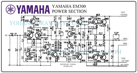 Di bawah ini adalah skema hasil pangkas dan edit pada seksi Power Amplifier milik YAMAHA EM300, yang mana sebenarnya ia adalah skema mixer dan power.